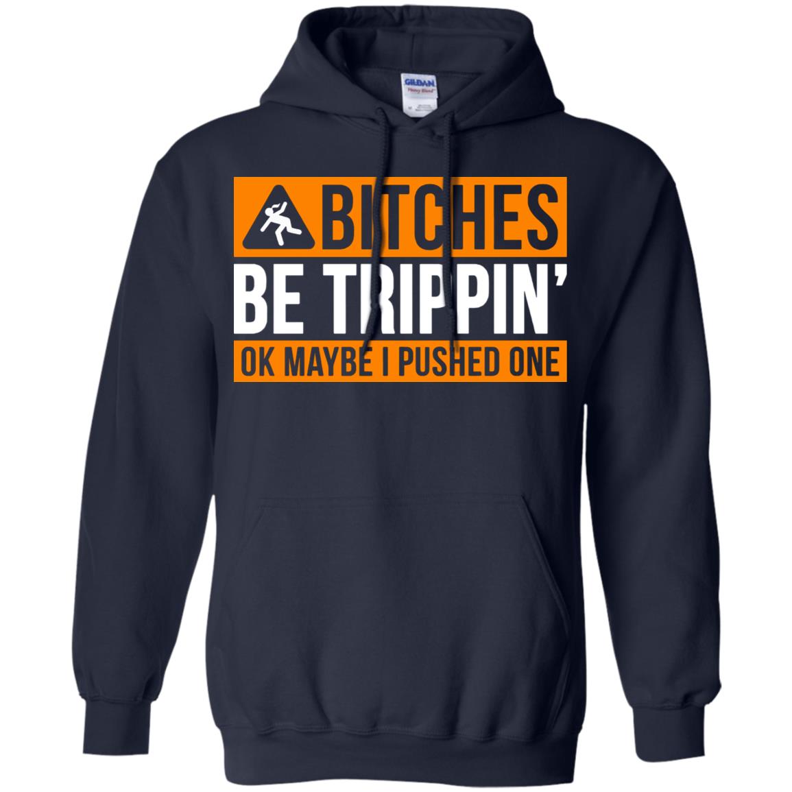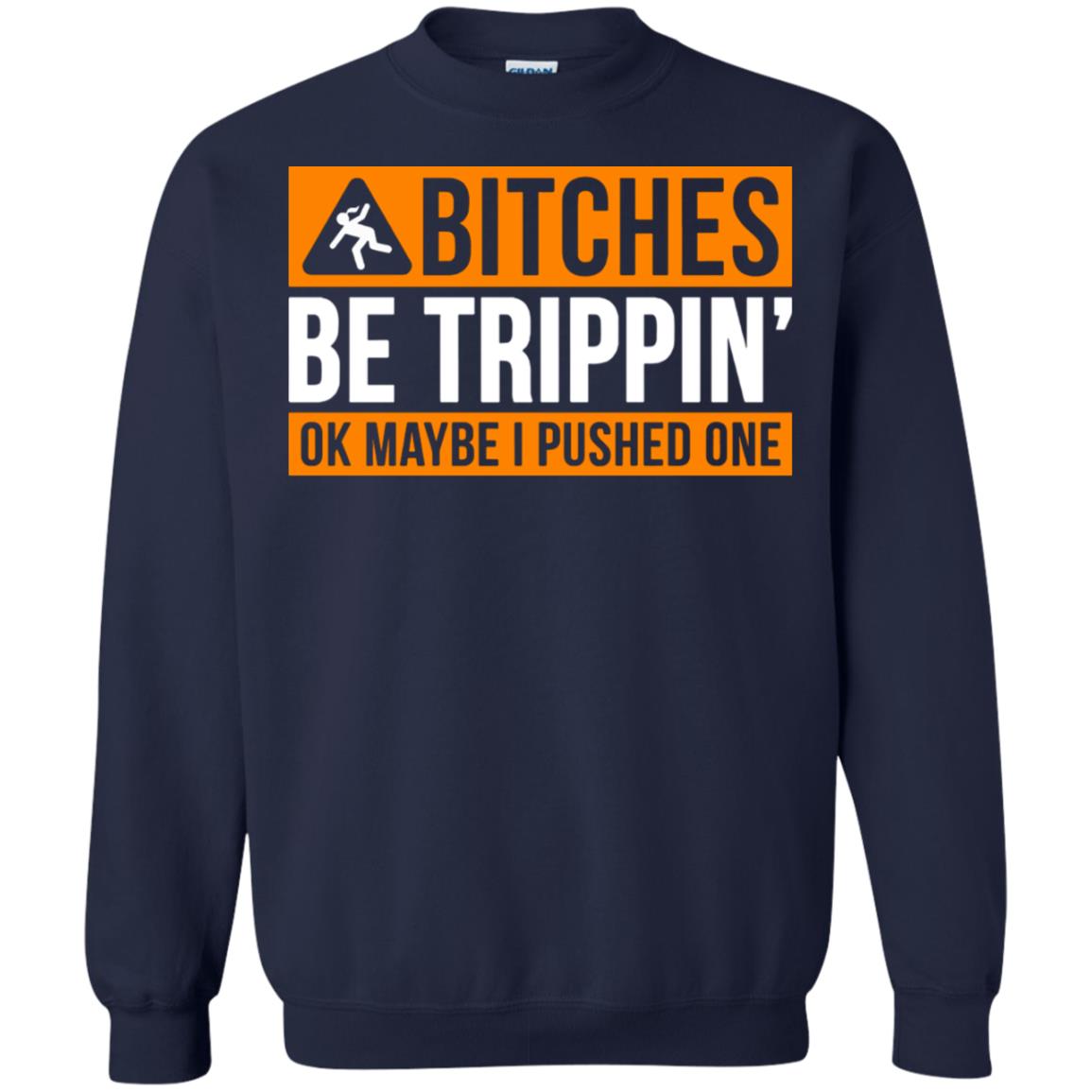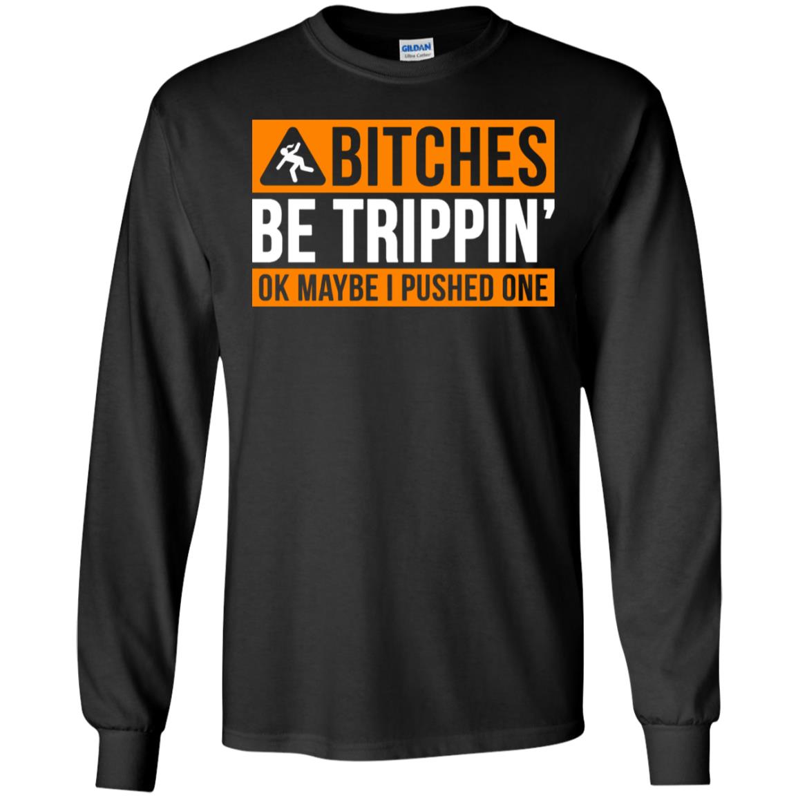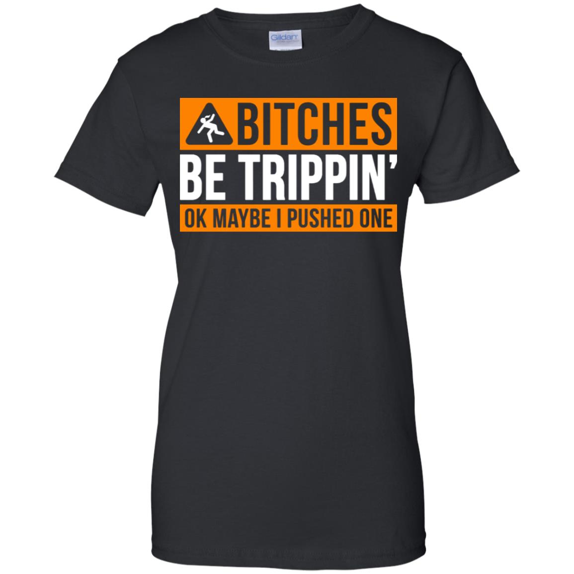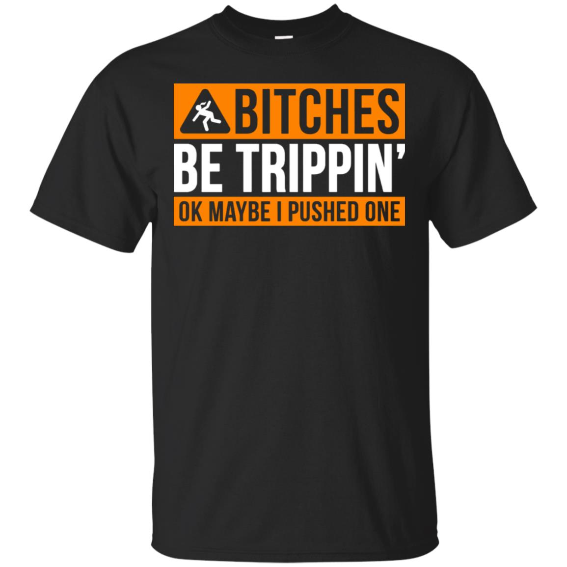 This tongue-in-cheek graphic shirt delivers dark comedy in a bold, high-contrast layout—warning sign icon up top, punchline underneath: “Be Trippin’ — OK, Maybe I Pushed One.” We’ve censored the wording here for listing purposes, but the physical design remains unchanged.