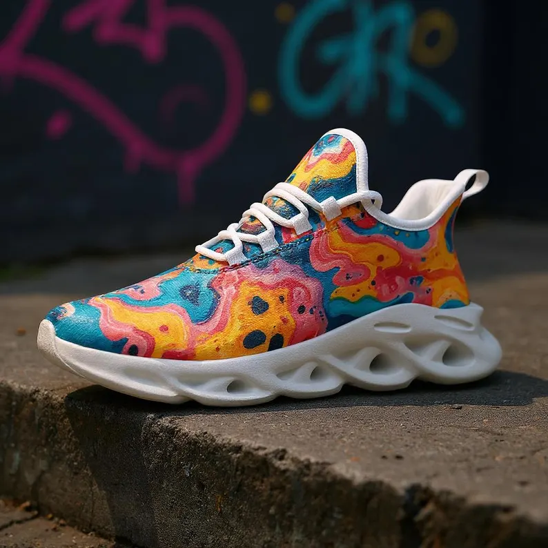 The futuristic wave-like sole adds a modern edge, while the breathable fabric keeps your feet cool and comfortable. Perfect for streetwear enthusiasts, artists, or anyone who loves bold fashion statements, these sneakers combine style, performance, and personality in one standout pair.