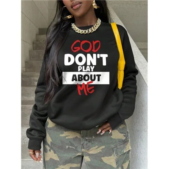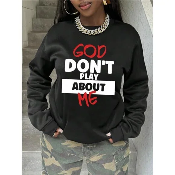The Black “God Don’t Play About Me” Sweatshirt combines comfort with a statement of faith. Made from soft, cozy fabric, it offers a relaxed fit perfect for casual wear or layering. The bold front print, blending red and white lettering, declares your belief in God’s unwavering care and protection. Ideal for anyone who wants their outfit to reflect their faith, strength, and confidence.