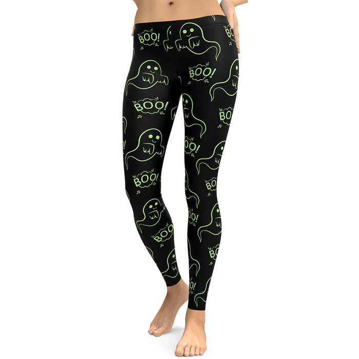 Black leggings decorated with playful neon-green ghost graphics and the word “Boo!”, perfect for adding spooky fun to your Halloween wardrobe.