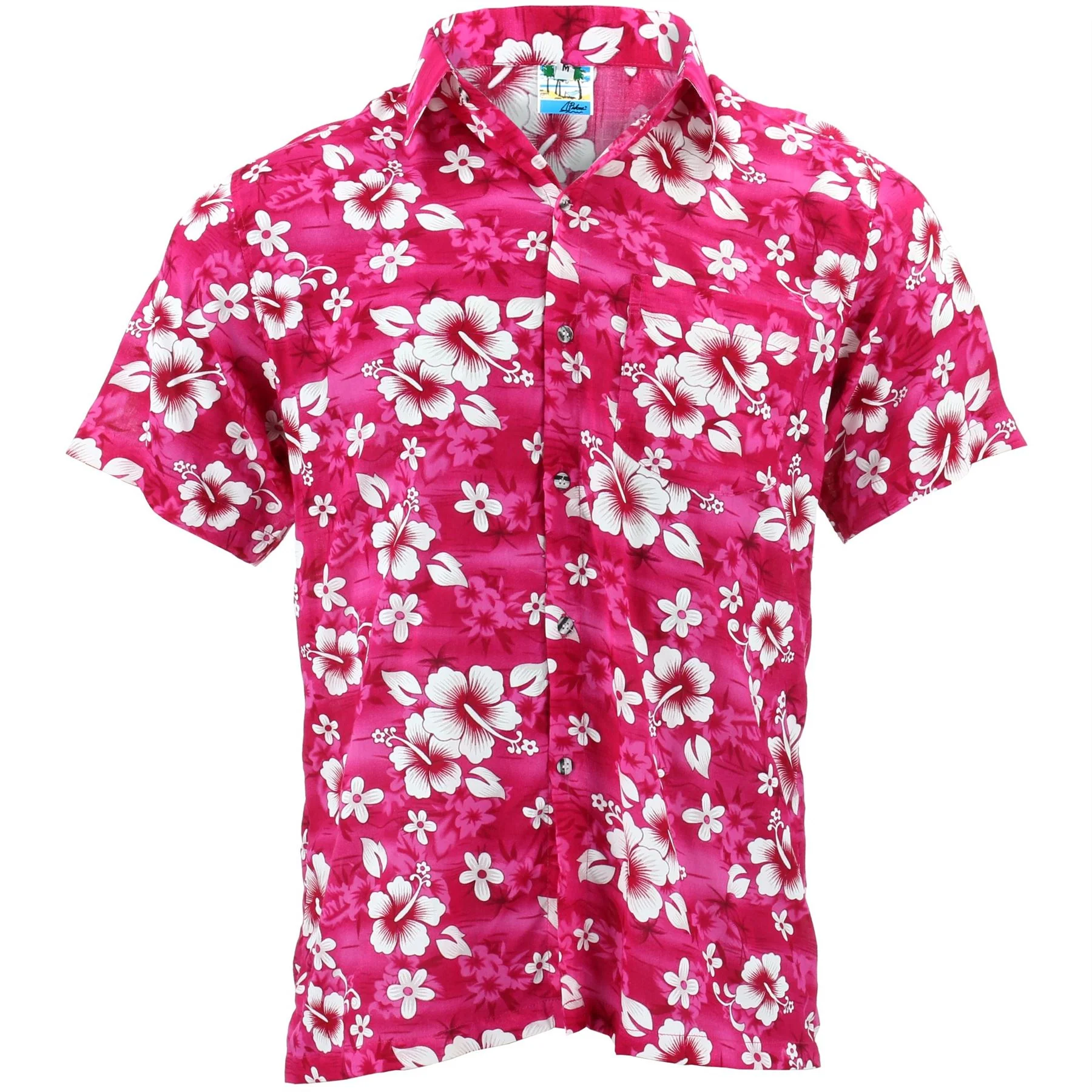 Make a statement in this island-inspired Hawaiian shirt covered in crisp white hibiscus and tropical blooms on a vivid pink backdrop. Designed for comfort and easy style, it’s a relaxed short-sleeve button-up with a spread collar and handy chest pocket. Pair it with shorts or chinos for laid-back weekends or party nights.