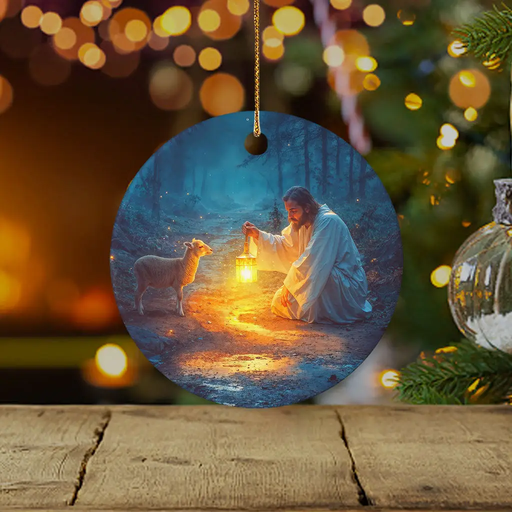 Add a touch of faith and warmth to your holiday décor with this double-sided ceramic ornament featuring a serene image of Jesus holding a lantern before a little lamb. Perfect for Christmas trees or as a heartfelt gift.