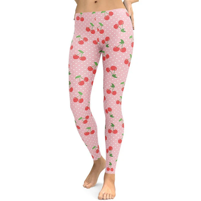 Adorned with bright red cherries and white polka dots on a soft pink background, these leggings bring a fun and playful vibe to your outfit.