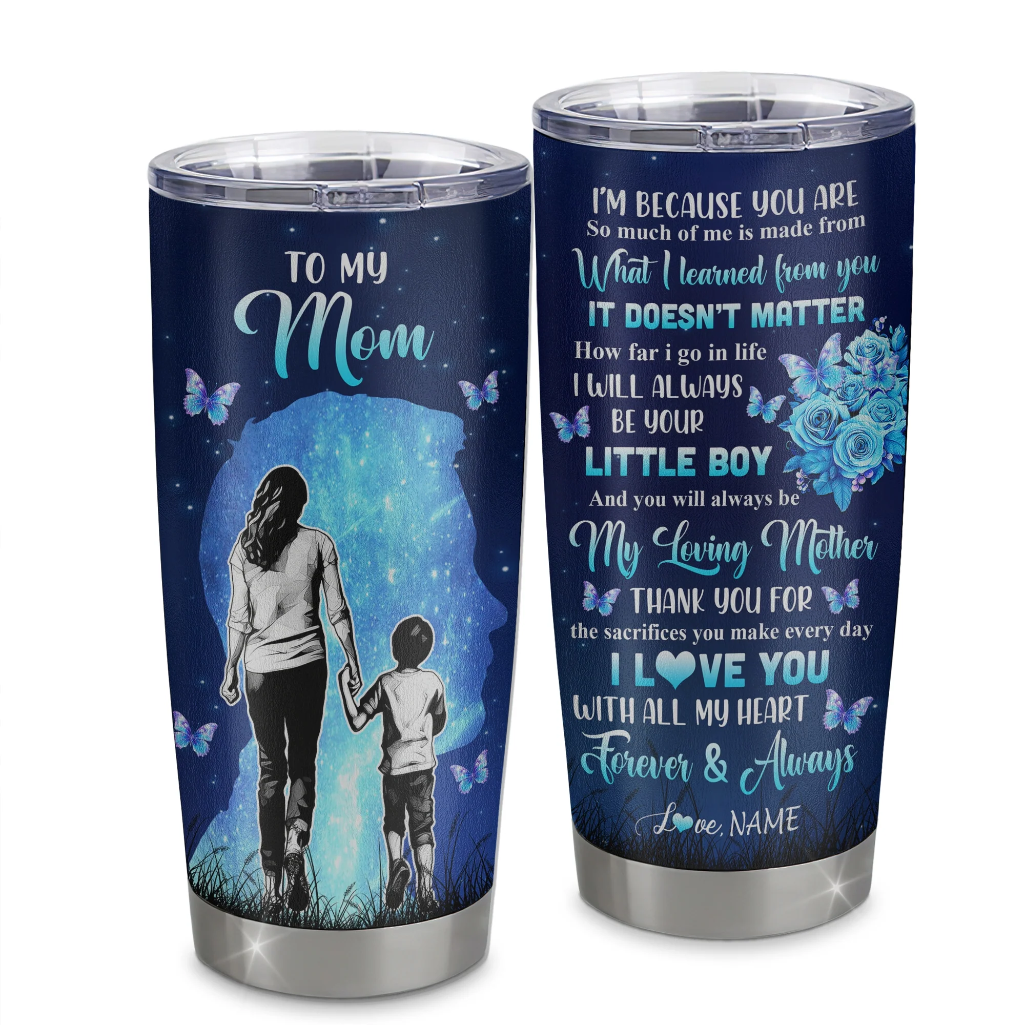 Celebrate the unbreakable bond between mother and son with this “To My Mom” tumbler. Featuring a beautiful design of a mother and son holding hands against a starry blue background with butterflies, this tumbler is both meaningful and practical. On the back, it carries a heartfelt message: