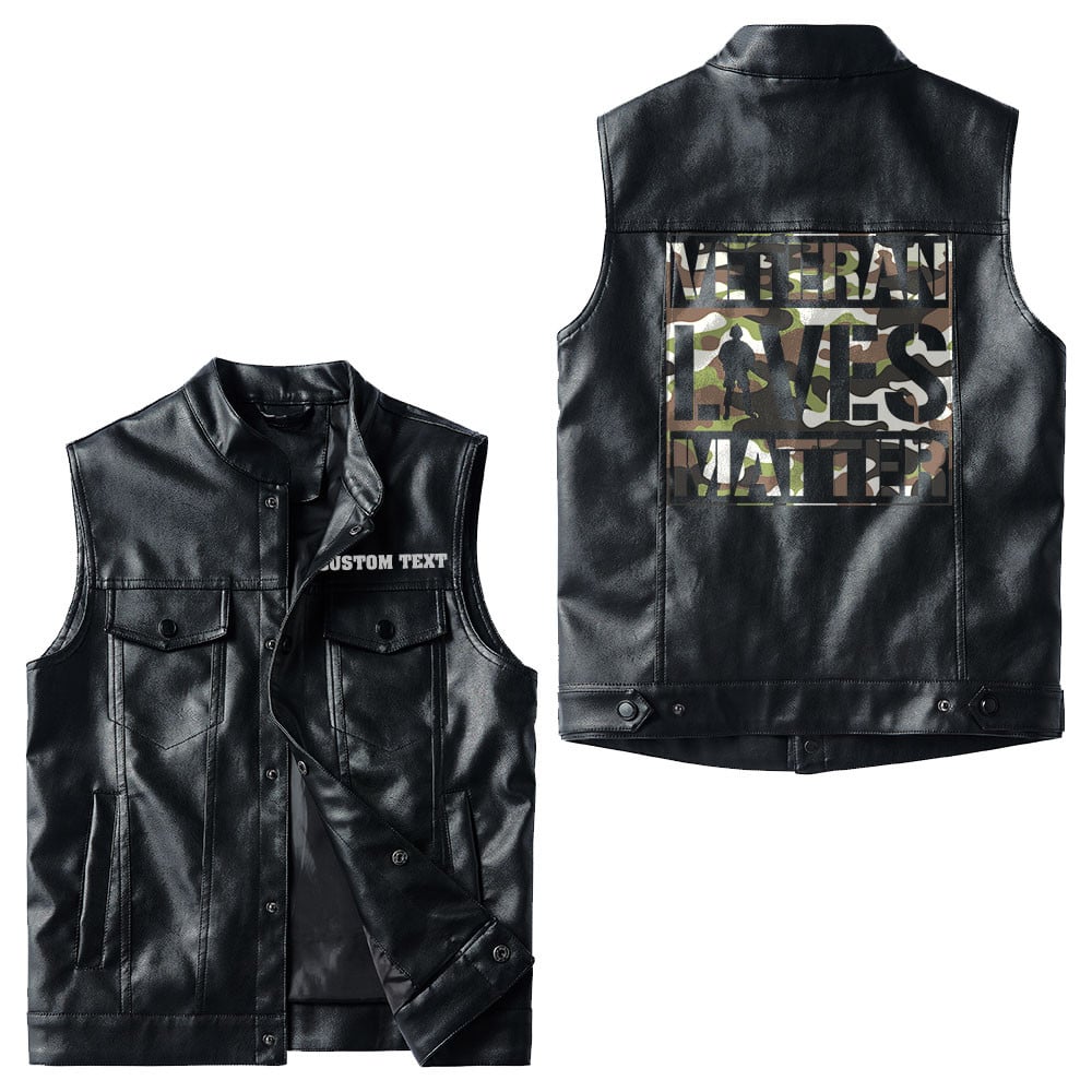 Stand tall and show your pride with this Veteran Lives Matter leather vest. Made from durable faux leather, this vest features a sleek snap-button front, flap chest pockets, and the option to personalize with custom text on the front for a unique touch. The back carries a bold statement: “Veteran Lives Matter” in camouflage print, symbolizing honor, respect, and recognition for all who have served.