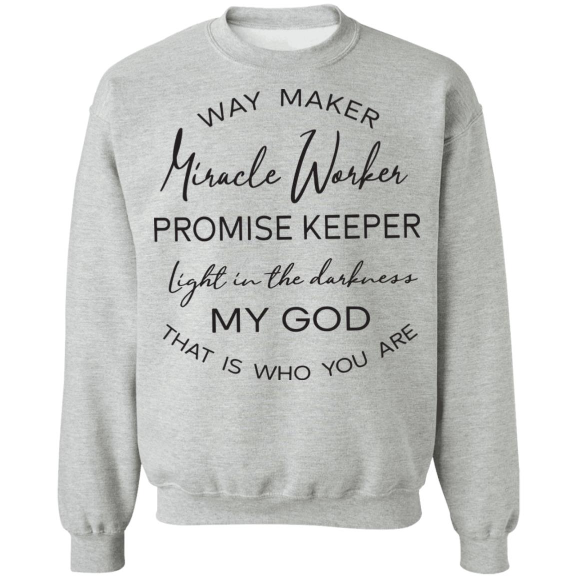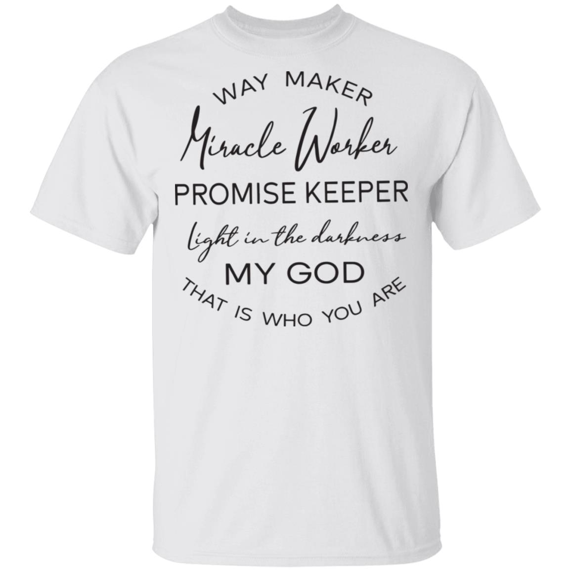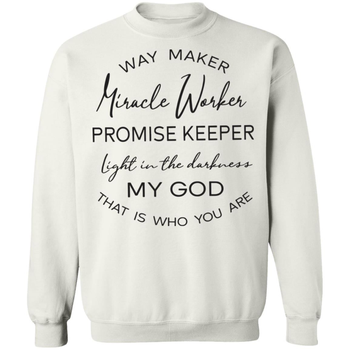 Wear your worship. This classic crewneck features a clean white base and a graceful mixed-font design that proclaims: Way Maker, Miracle Worker, Promise Keeper, light in the darkness—My God, that is who You are. Printed on a soft, everyday shirt that’s comfortable, breathable, and made to last.