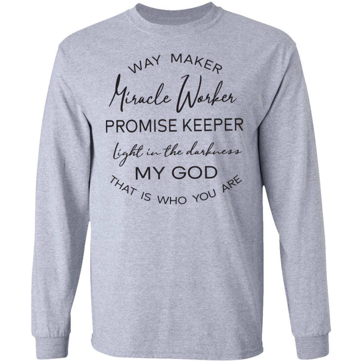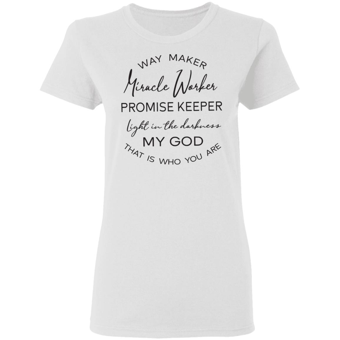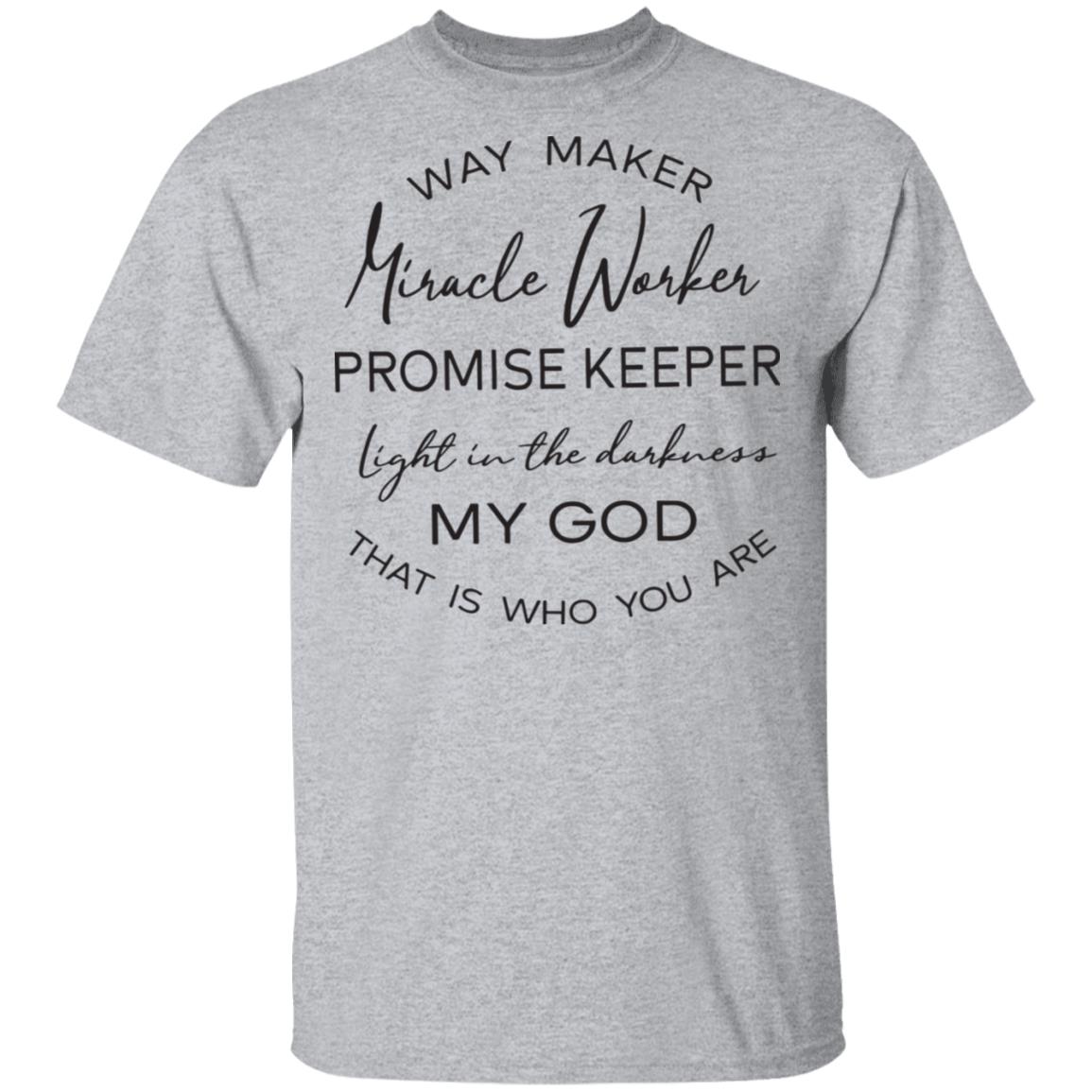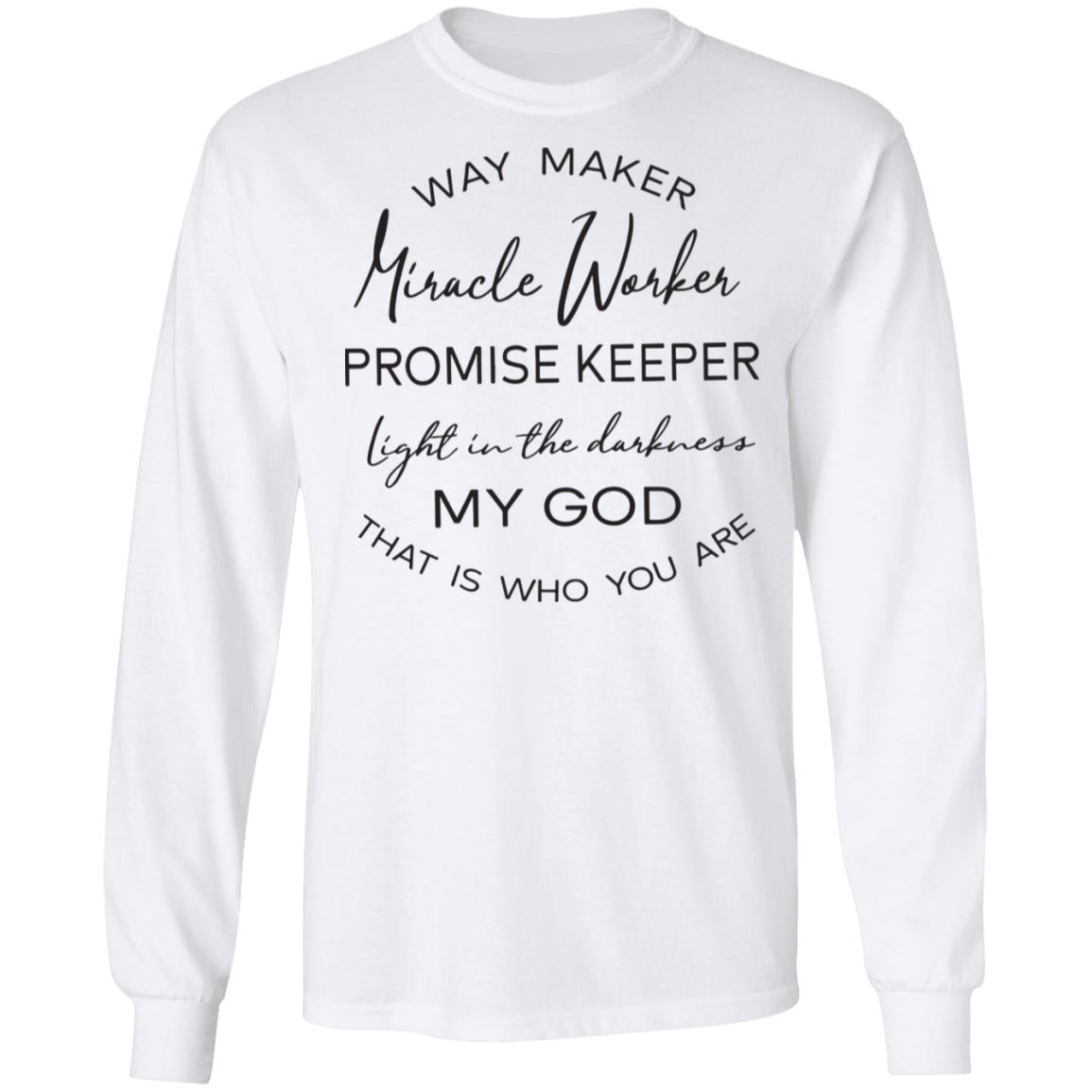 Wear your worship. This classic crewneck features a clean white base and a graceful mixed-font design that proclaims: Way Maker, Miracle Worker, Promise Keeper, light in the darkness—My God, that is who You are. Printed on a soft, everyday shirt that’s comfortable, breathable, and made to last.